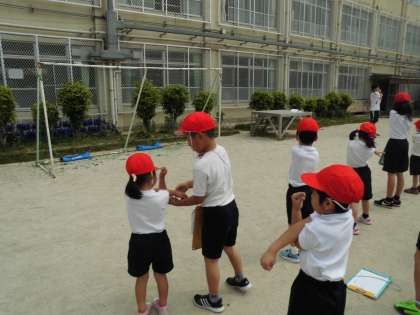 ペア学年と一緒に体力テストをしました。先日「なかよしの会」をしたばかりなので,顔と名前は分かっています。今回は,ペア1年生と一緒にそれぞれの場所へ行き,5種目の体力テストを受けました。