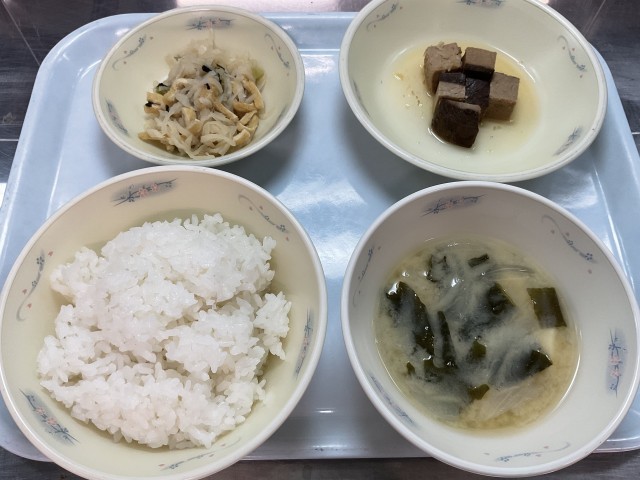 今日は、月に一度の和食を味わうなごみ献立の日でした。なま節はかつおをゆでた後に、煙でいぶして作ります。かつおは、春と秋の2回、旬があります。春のかつおは「はつがつお」とよばれ、脂が少なく、うま味が強いのが特徴です。今日のみそ汁は、春が旬の「たまねぎ」と「わかめ」を使っています。春にとれるたまねぎは、やわらかく、辛味が少ないのが特徴です。