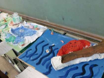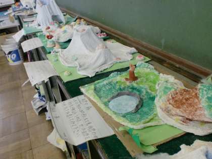 子ども達は,固まった形を台地や生き物に見立てて,工夫しながら作品にしました。
