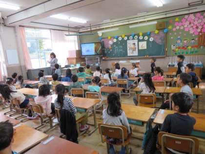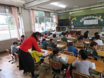 1年の国語では書写の学習をしました。静かな雰囲気の中で鉛筆をもって,課題に取り組む1年生の姿が見られました。