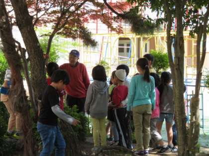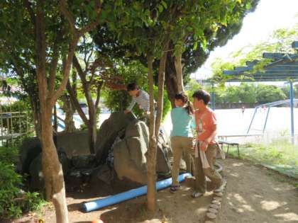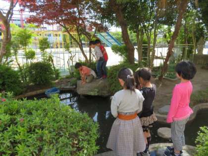 きれいになったひょうたん池で子どもたちが観察をしていました。岩陰に隠れている金魚の群れを見つけて歓声をあげる子たちもいました。たまたま来られていた福井さんに子どもたちが池のお掃除のお礼を言う場面も見られました。