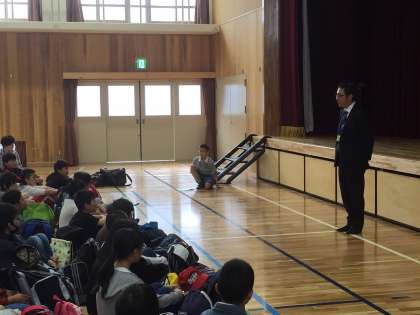 すこし肌寒い朝となりましたが,子どもたちは元気に登校し,出発式を行いました。4・5年生で宿泊学習を体験してきましたが,修学旅行はその集大成です。