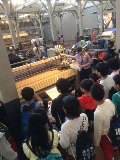 グループの仲間と,紡績産業や自動車工業の歴史等を見学しています。大きな展示物の前では,施設の方の説明を夢中で聞き入っています。