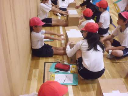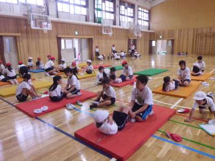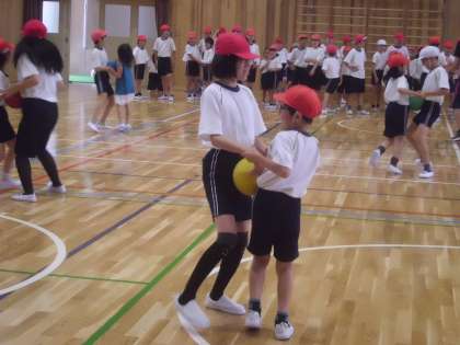 2年生とペアを組んで,2回目の体力テスト「反復横とび」「長座体前屈」「上体起こし」を計測しました。計測が終わって時間に余裕があったので,6年生と2年生のペアでボールを使ったリレーをしました。2人でボールを体で挟んで落とさないように楽しんで取り組むことができました。