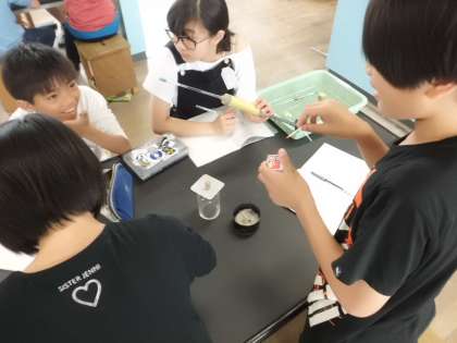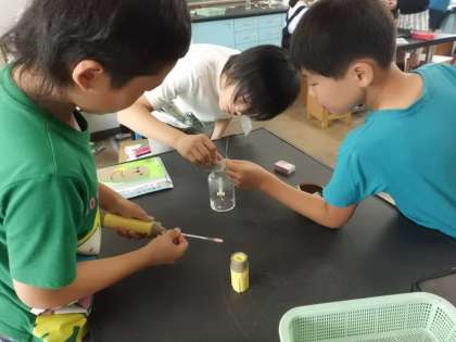 また,燃焼前後の空気の酸素と二酸化炭素の変化を気体検知管や石灰水を使って調べました。酸素の一部が使われて,ものが燃えることを実験を通して理解することができました。