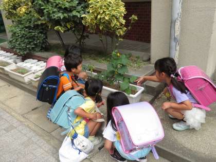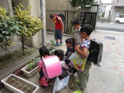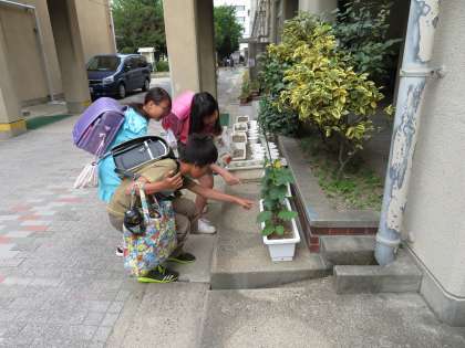 やはり,登校した子どもたちは,ふくらんできた実を見つけて大騒ぎ。「やっぱりこれキュウリやな。」「上の方に小さな実もふくらんでる!」「かわいい!」等と口々にいろんな話をしていました。