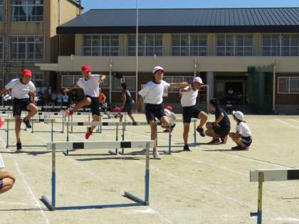6年生の個人走も「50mハードル走」です。5年生よりもハードルの高さが高くなり,一段と跳び越すのが難しくなっていますが,リズムよく跳び越すことを意識して,軽やかに跳んでいきました。