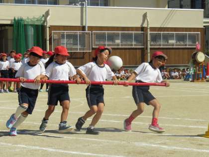 3年生の団体競技「塔南乃風」です。3年生は“台風の目”にチャレンジしました。4人が一組となり,長い棒をもって走ります。次の番の子どもたちに渡す前には,棒を,待っている子どもたちの下を通し,上から戻してきます。同じ色の仲間とタイミングを合わせてジャンプしなければいけません。また,途中のコーンをどれだけスピードを落とさず回れるか,も勝負の鍵となります。