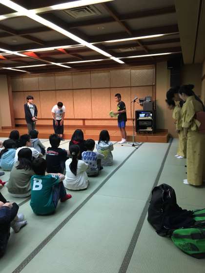 本日の予定の見学を終え,竜宮ホテルに到着しました。広間に集合し,入館式を行いました。これからホテルで過ごす時間は,見学とはまた違った楽しみがあると思います。マナーを守りつつ,全員で楽しい時間を作ってほしいと思います。
