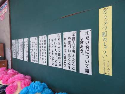 国語のの学習では「どうぶつ園のじゅうい」という学習をしました。学習のめあては「いつもしていること,この日だけしたことについてまとめよう」でした。単元の初めから終わりまでのすべての学習のめあてを教室に貼って,見通しをもちながら学習を進めています。