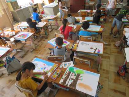 図工の学習では「お話の絵」の学習をしています。学習のめあては「イメージをふくらませて絵をかこう」でした。コンテやパスを使って,自分のイメージを絵にしている子ども達でした。いつものことながら,子ども達の絵がもつエネルギーには感動します。