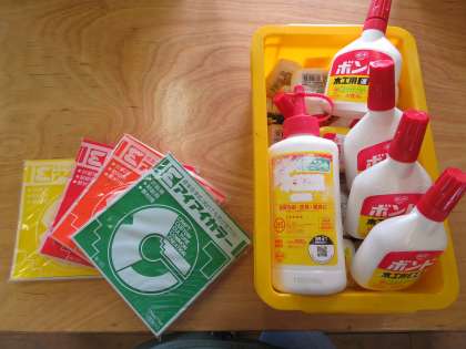 ひんと3:おりがみ や ぼんどなど こうさくをするどうぐが あります。