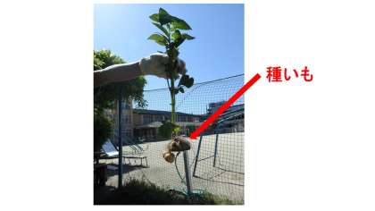 3月に植えたじゃがいもがぐんぐん育ち,きゅうくつそうだったので間引きをしました。じゃがいもは,種や苗を植えるのではなく,「種いも」という種にするためのいもを植えます。ぬいてみたら,種いもから根や茎,じゃがいもの赤ちゃんが育っていました。