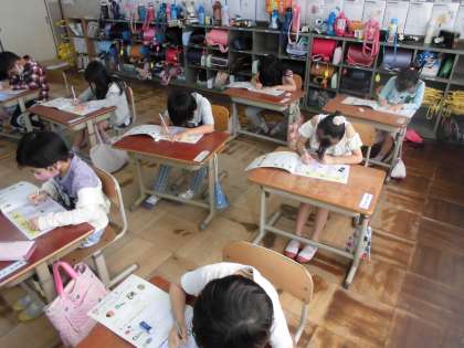 新しい文字を習うことに,きらきらした顔を見せてくれる1年生です。