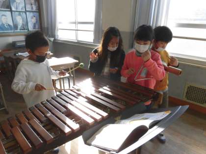 木琴や鉄琴,打楽器などのパートに分かれ,心を合わせて演奏します。