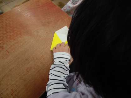 今日は,壁飾りのために折り紙を折りました。