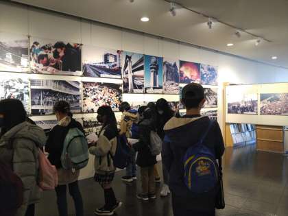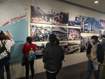 実際に阪神淡路大震災を体験した館長さんの当時のお話を聞いてから,館内の見学をしています。
