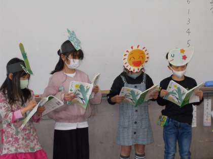 班で練習してきた音読の発表会をしました。お話の場面の様子や登場人物の気持ちが表せるように,声の大きさや話すスピードを考えて発表しました。役のお面をかぶって,真剣な表情で取り組む姿がとても微笑ましかったです。