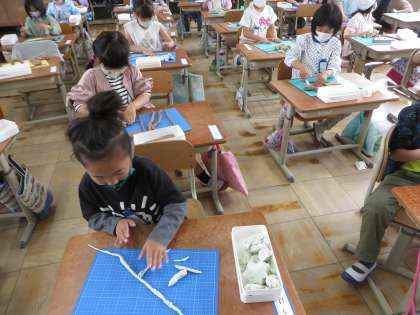 図工の時間に,ねんどをひも状にのばし,重ねたり渦巻にしたりして自分のイメージを形にしていきました。