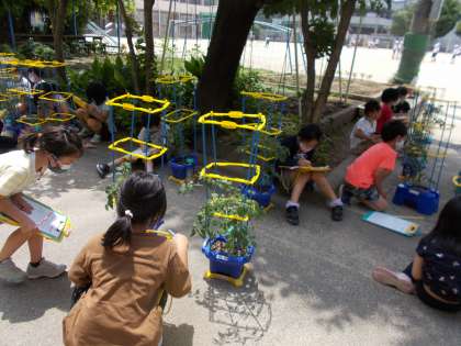 黄色い花は咲いたり,緑の実がたくさんできたりしてきました。また,くきが太くなったことに気づいた人もいました。トマトの実が,赤くなるのが待ち遠しいです。