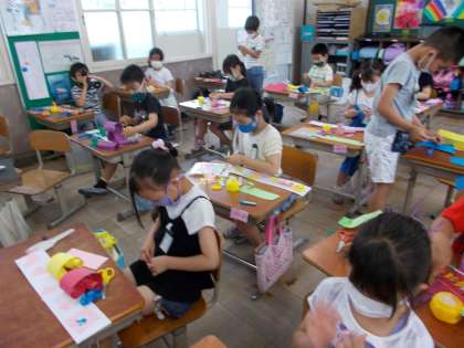 画用紙を切ったり,折ったり,丸めたりして冠を作りました。色とりどりの楽しい作品が出来上がり,頭にかぶってみんなキャッキャッと喜んでいました。来週には写真をとって,お互いの作品を鑑賞します。