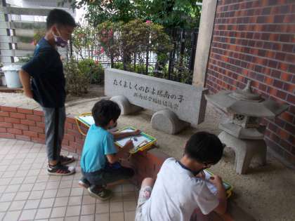 学校の中にあるもので,みんなに知らせたいものを見つけて,文章にして友達に知らせます。今日は,学校の中を探検して,おもしろいものやみんなに知らせたいものを見つけて,メモをしました。生活科の学習でも,何度もメモをしているので,上手にメモをしていました。