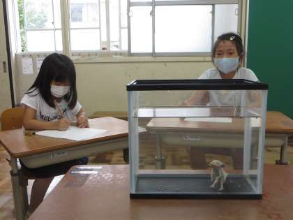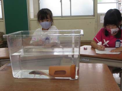 学校探検で見つけた生き物を思い出し,うさぎ,メダカ,ウーパールーパーの様子を観察しました。