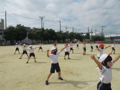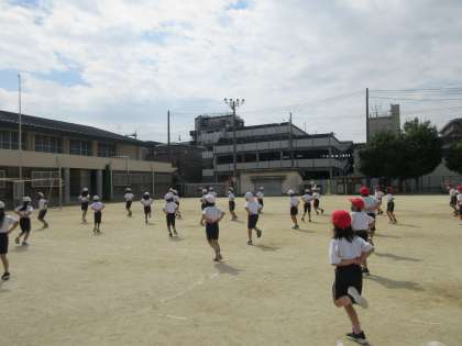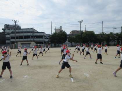 スポーツフェスティバルのダンス練習を,はじめて運動場ですることができました。体育館とは違う広々とした運動場で元気一杯にのびのびとダンスできました。