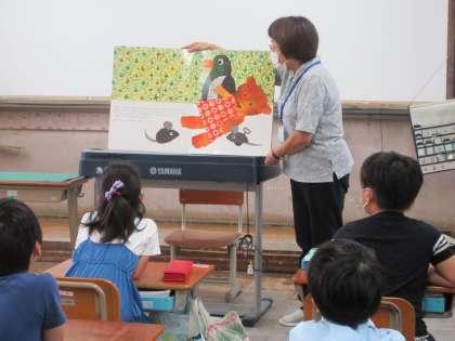 朝の気持ちの良い始まりの時間に,学校司書の田村先生の大型絵本の読み聞かせがありました。色彩豊かな画面と,かわいいネズミさんのお話に子どもたちは目を輝かせて聞き入っていました。