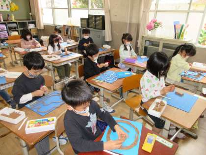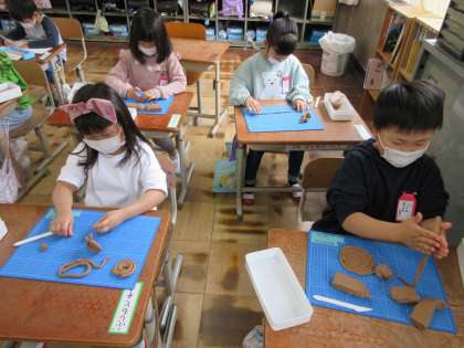 粘土をひも状に長く伸ばして,それを使って何が作れるか考えました。「ヘビができたよ。」「グルグルドーナッツだ!」と,どんどん想像がふくらんで素敵な作品がたくさんできました。教室がほんわかしたムードに包まれて,とても楽しい時間をすごせました。