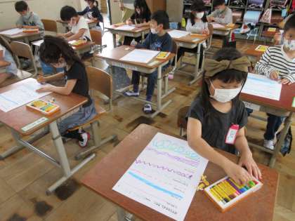 新しいクレパスの箱を開けて,線の描き方や面の塗り方の練習をしました。同じ色でも塗り方を変えると様々な変化がつくことを知って,子どもたちは,歓声をあげていました。校長先生も子どもたちの様子を見に来てくださいました。