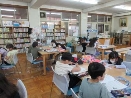 図書館司書の藤井先生に,本の借り方や,図書室の本の配置などについてお話をいただきました。絵本の読み聞かせの時間もあり,子どもたちはお話の内容に聞き入っていました。絵本バッグに好きな本を借りて,とても満足そうに教室に戻りました。