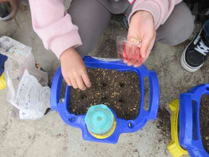 一人6個ずつの種を大切そうに握りしめ,少し緊張気味に鉢に植えました。最後に大きな花が咲きますようにとお祈りをして,優しく水やりをしました。