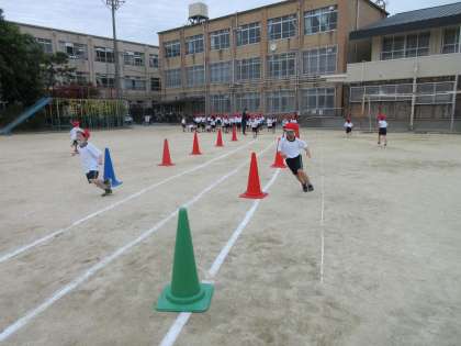 体力テストの50メートル走の記録をとってから,コーンを使ってジグザグに走るかけっこ遊びをしました。1年生は運動が好きな子どもが多く,スピードを上げて楽しく走ることができました。