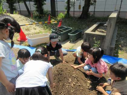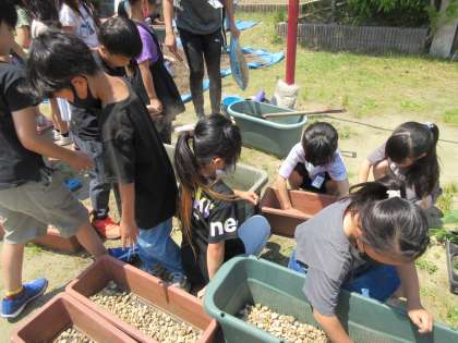 プランターに土を入れ,苗を植えました。土づくりから奮闘する子どもたち。ミニトマトに加え,きゅうり,えだまめ,さつまいも,おくらの5種類の野菜を育てます。育てる大変さを実感しながら,愛情と責任感たっぷりに育ててほしいと思います。