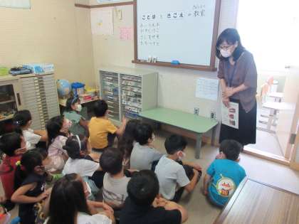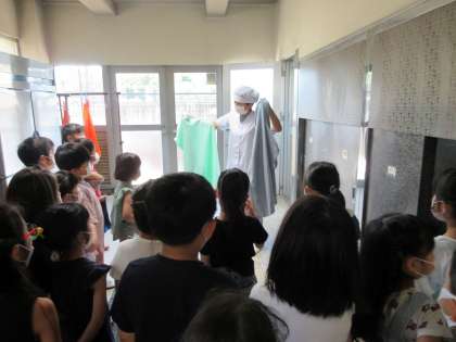 ことばときこえの教室の先生と,給食調理員さんに学校でどんなお仕事をされているのか,お話を聞きました。ことばときこえの教室の先生には,舌の動かし方や声が出る仕組みなどを教わりました。給食調理員さんには,3種類のエプロンの使い分けを教えていただいたり,大きなお鍋に金時豆を入れる様子を見せてもらったりしました。初めて知ることに興味津々な子どもたちでした。