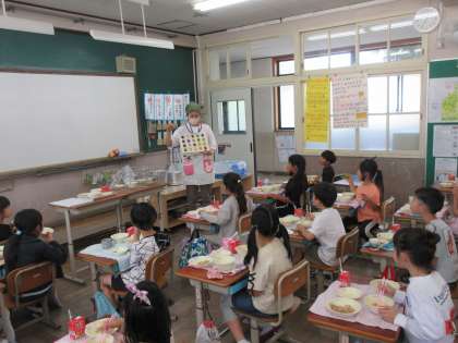 今日の給食の金時豆について,栄養教諭の先生に教えていただきました。話をきいた後は「おかわり!」の声がいっぱいでした。