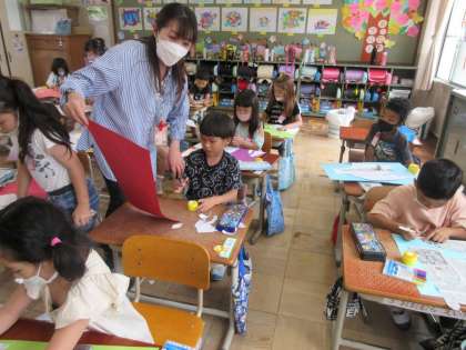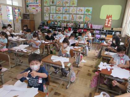 画用紙や新聞紙をやぶいたりちぎったりして,何の形に見えるか考えました。子どもたちは,やぶいた紙が動物や建物などいろいろな形に見えることを発見して,楽しく想像の世界をふくらませていました。