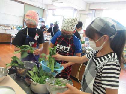 作ったものは,ほうれん草,小松菜,じゃがいもの茹で野菜です。