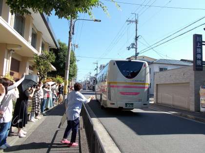青葉若葉が美しく,雲一つない快晴の中,6年生が修学旅行へと出発しました。