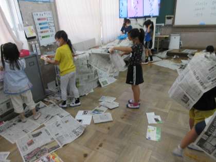 新聞紙をたくさんさわって,自由に遊びました。「ふんわり,ひらひら,くしゃくしゃ,くるくる」。思いついたことから表現を楽しみました。子どもたちの表現力,とても素敵でした。