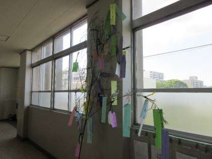 笹に短冊や自分たちで作った飾りを付けて、廊下に飾りました。