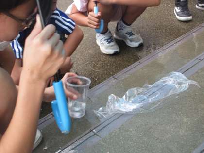 水はどのように流れているのか予想し、坂になっているところや階段などで実験しました。水の流れる方向は,地面のかたむきと関係があることが分かりました。