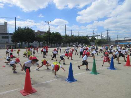 運動場に出てのスポーツフェスティバルの練習が始まりました。2年生と合同の練習なので、かっこいい上級生のダンスに憧れを持っているようです。まだまだ暑いですが、元気にがんばって練習し、どんどん上達しています。