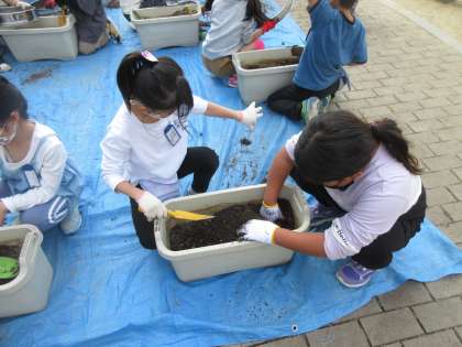 九条中、九条弘道小学校、九条塔南小学校の三校で進めている「通学路に花を飾る」プロジェクト。先週、2年生と3組の子どもたちでプランターに花を植えました。一生懸命、土づくりや水やりを行っていました。植えた花は、それぞれの校区に飾られます。