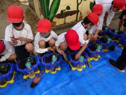 朝顔を育てていた植木鉢に,チューリップの球根とビオラの苗を植えました。何色のチューリップが咲くかはお楽しみです。元気に育ってくれるように,丁寧に水やりをしていました。