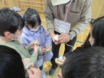 地域の方々をお招きして、こま、お手玉、けん玉、あやとり、めんこの昔遊びを教えていただきました。子どもたちは,普段の生活の中でなかなか出会うことが少なくなった遊びに興味津々で、いつまでも遊んでいたい様子でした。