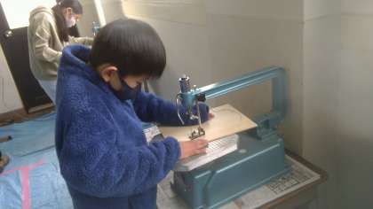 ドキドキしながら電動糸のこぎりで板を切る子ども達。