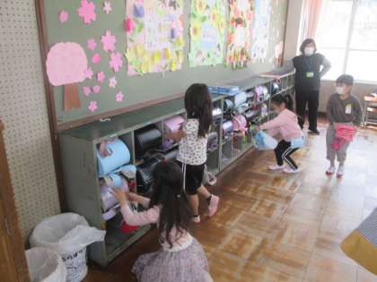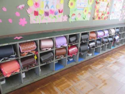教室のうしろのロッカーにランドセルや荷物をいれます。その入れ方も,先生の話をしっかり聞いて覚えます。すべてのことが1年生にとっては初めてで,すべてのことが学習です。ピカピカのランドセルが,きちんと整頓してならんでいるロッカー,とてもきれいですね。