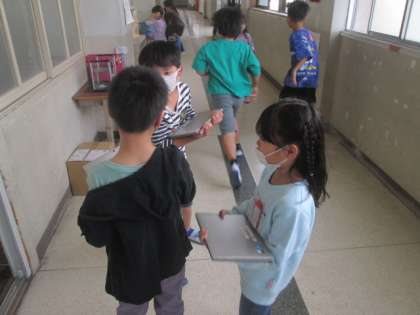 11時から,1年生以外の子どもたちは,一斉にタブレット端末の移動をしました。GIGAスクール構想により,一昨年度から一人一台のタブレット端末を使って学校でも学習を進めていますが,昨年度の教室に置いたままにしていたものを,保管庫から取り出して,新しい教室に運びます。両手で大事そうに抱えて運ぶ子どもたち。今年度も,集団での学びと個別最適化された学びを融合させながら,効果的にタブレット端末を使用していきます。